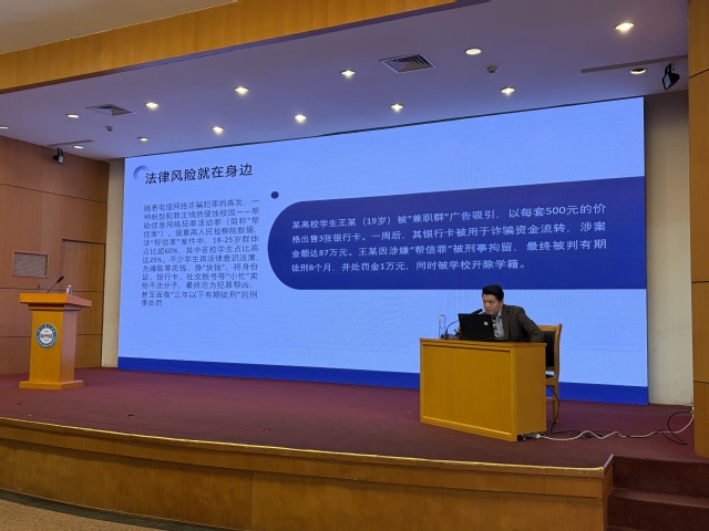 讲座中,公安玄武分局反诈大队民警潘启迪结合高校高发电诈案件特点,以《高校高发电诈案件防范提示》为题,通过典型案例剖析,为师生讲解防范电信诈骗的实用技巧;江苏刘洪律师事务所律师符志峰则围绕《大学生日常法律风险》,通过真实案例解析,帮助学生识别和规避法律风险。两位专家的宣讲兼具理论深度与实践指导性,现场师生反响热烈。