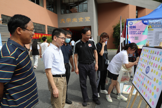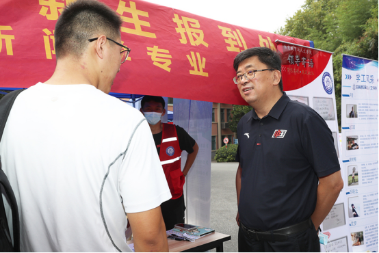 校党委副书记、校长杨国庆在报到点与新生亲切交流