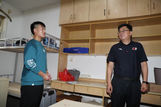 校党委副书记、校长杨国庆在灵谷寺校区学生宿舍与新生亲切交流