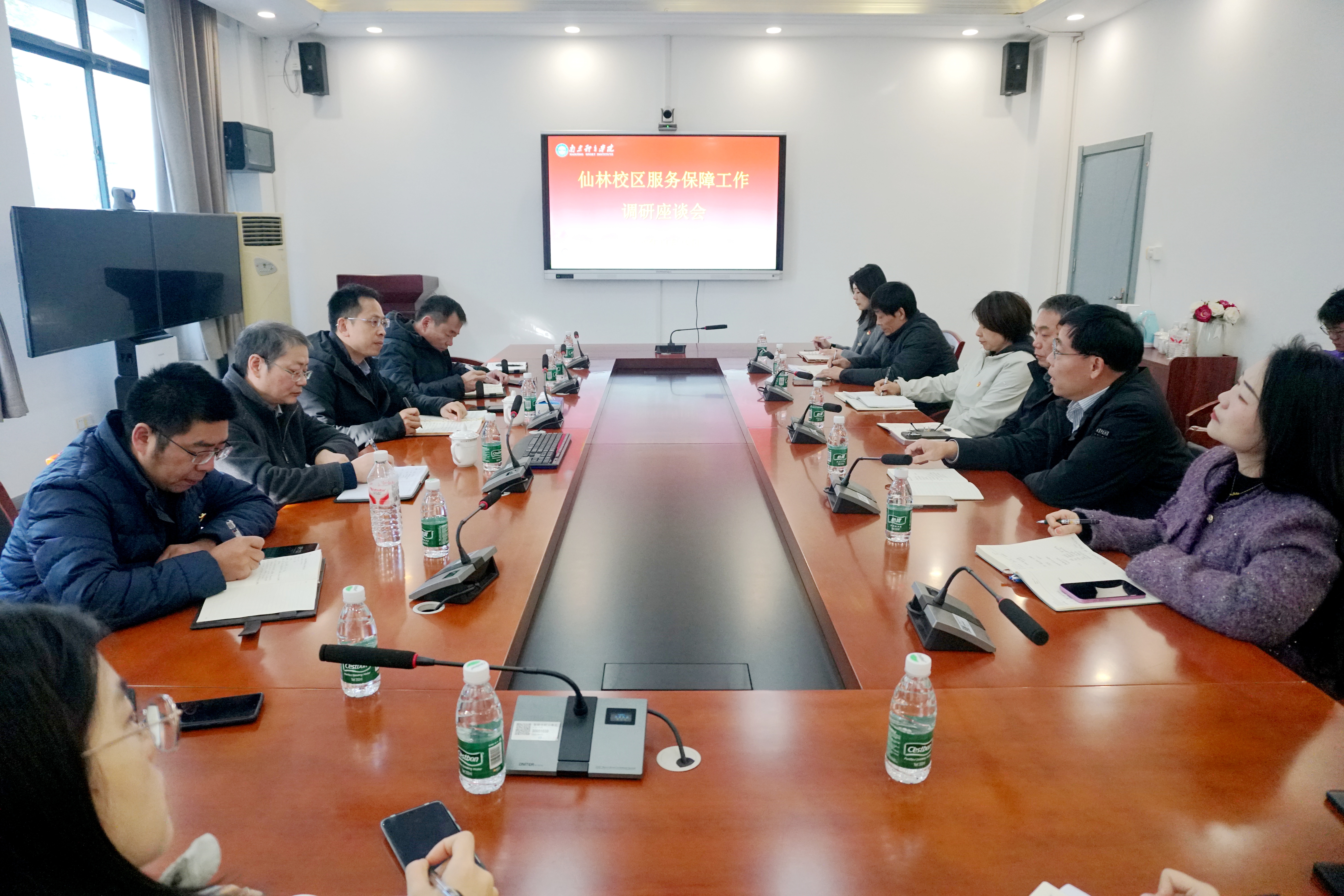 11月19日上午,校党委常委、副校长王猛专题调研仙林校区服务保障工作,运动训练学院、体育产业与休闲学院领导班子成员、办公室主任、辅导员、教学秘书及教师代表,计划财务处负责人,仙林校区管委会办公室全体成员,以及物业、餐饮、安保负责人共同参加了调研座谈。