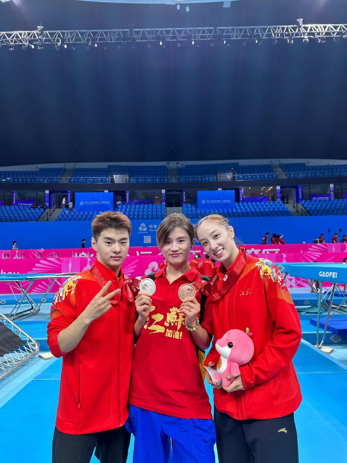 体能教练陶柳(中)助力王梓赛夺金、邱铮夺铜