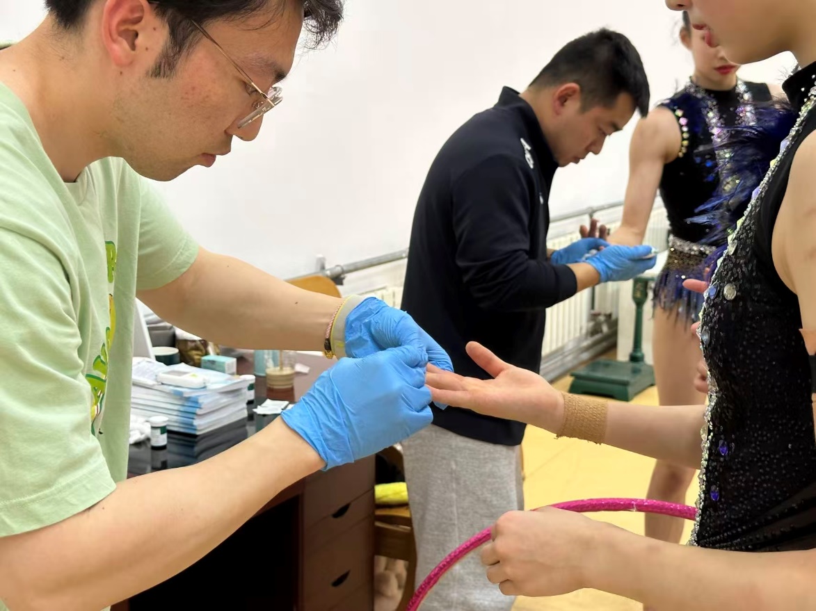体能教练翁凯利给艺术体操队运动员做血乳酸测试