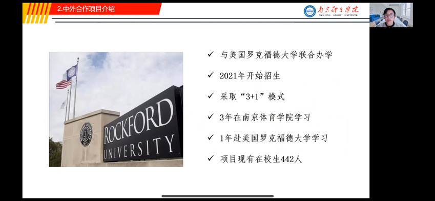 柏景岚副院长介绍了中外合作办学项目的运行情况。中外合作办学项目建设以我校体育经济与管理专业国家一流本科建设为依托,以培养国际化、高端化体育产业管理人才为目标。自2021年以来,项目共招生四届学生,在校生442人。柏景岚副院长介绍了罗克福德大学的办学历史、师资实力、教学资源和学生在南京体育学院三年的学习生活情况;对家长们比较关注的出国访学费用支出、安全保障等方面的问题给予详细阐述。