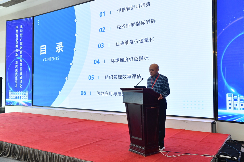 学术论坛由江苏省现代休闲体育研究院院长徐悦主持,华东政法大学商学院余守文教授和南京体育学院体育产业与休闲学院系主任、张建明副教授做大会报告。余守文以《体育赛事的多元价值探讨》为题,运用双重差分模型(DID),用计量经济学的范式探究体育赛事的多元价值。张建明则围绕“赛事评估四维指标体系解析”,深入剖析了数字化时代赛事综合效益评估的关键维度,为赛事绩效的精准衡量与持续优化提供了方法论指导。两场报告视角独特、内容翔实,为推进体育赛事治理现代化提供了重要的理论参考。随后南京体育学院体育发展与规划研究院副院长车冰清教授主持论文报告会。多位学者就赛事风险管理、数字化治理、发展路径等议题发表研究成果。