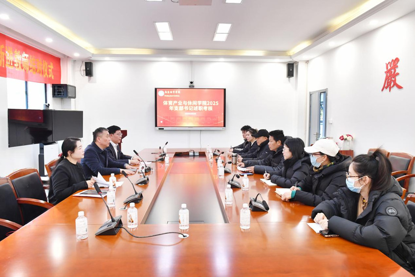 12月23日中午,体育产业与休闲学院党总支在南京体育学院仙林校区A105会议室成功组织召开2025年度党支部书记抓党建工作述职评议会。体育经济与管理系党支部书记张建明、社会体育指导与管理系党支部书记曹全军、休闲体育系党支部书记朱金宁以及学生党支部书记王珺君依次进行了现场述职,全面展示了各自的履职情况。随后,学院党总支书记王进对述职情况进行了集中点评,并对2026年的党建工作做出了具体部署。