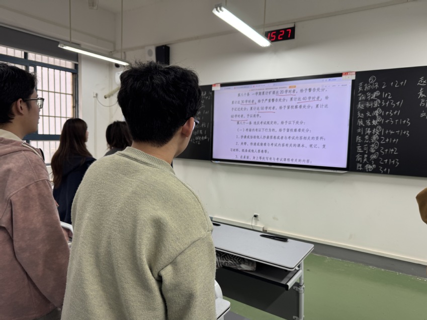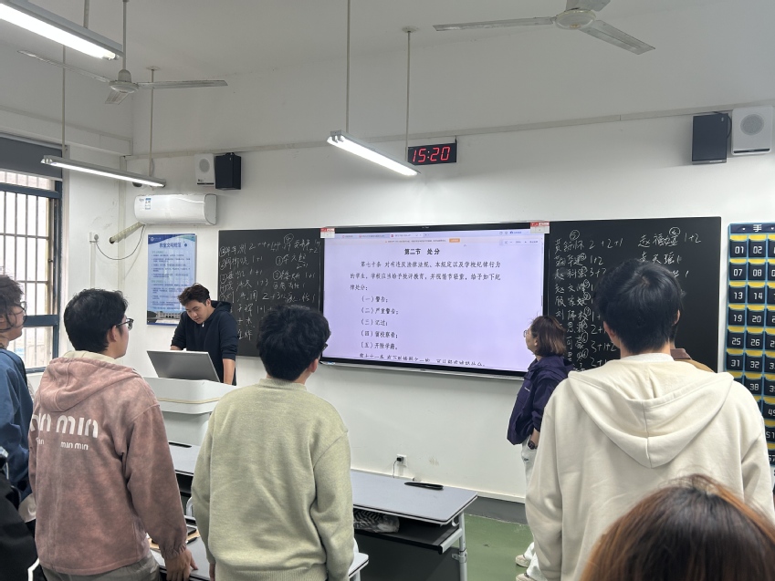 随后,全班同学共同研读《学生手册》,重点带领大家学习手册中关于旷课的界定标准、考勤管理要求及相应处分细则:一学期累计旷课达20学时者,给予警告处分;累计达30学时者,给予严重警告处分;累计达40学时者,给予记过处分;累计达50学时者,给予留校察看处分;累计达60学时者,予以退学。让同学们清晰知晓旷课行为的纪律红线和严重后果。