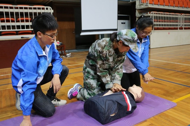 为了使同学们能够更直观地了解相关知识,马老师与“应急救护”社团的同学们给大家带来了“情景再现”。同学们配合着老师的讲解,模拟了军事训练中发生晕厥、肌肉抽筋时的现场急救,展示了急救包扎技术。老师生动详细的讲解,社团同学娴熟专业的技能展示,搏得了军训学员的阵阵掌声。针对现时生活中可能发生的呼吸心跳骤停现象,马老师给军训学员们详细介绍了心肺复苏技术(CPR)及体外除颤仪(AED)的使用方法。在老师和急救社团同学们的细心指导下,军训学员和施训教官也分分上场学习和体验。