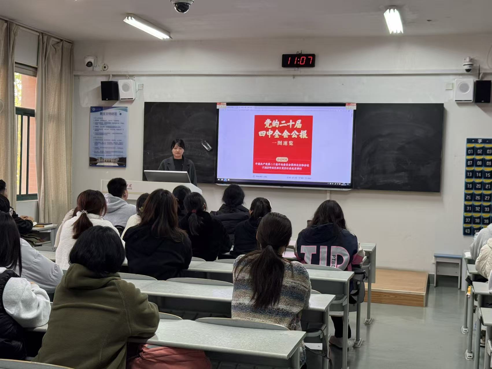 11月12日中午,运动健康学院本科生党支部在图书馆第二报告厅召开党的二十届四中全会精神专题学习会。支部书记刘莉传达了校党委理论学习中心组学习(扩大)会议精神,领学了全会公报和《中共中央关于制定国民经济和社会发展第十五个五年规划的建议》等重要内容,重点解读了全会关于与学院学科专业、学生成长成才紧密相关的重要论述,并呼吁与会学生党员积极践行全会精神,将个人成长与时代使命深度融合。在学习研讨环节,学生党员踊跃发言,分别结合自身学习、实习、生活和思想实际分享学习体会与感悟。