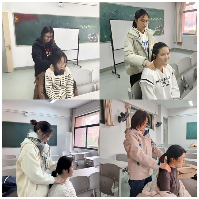 活动中,学员们分组行动,精准对接同学们的需求。面对肩颈僵硬问题,学员们运用“揉法”“拿法”等专业康复手法,进行放松调理,并耐心讲解日常办公间隙可进行的微运动与姿势调整技巧,传递科学保健理念。与此同时,另一组学员深入班级,为长时间低头阅读、操作仪器或使用电脑的同学提供即时放松服务,并普及运动损伤预防知识,成为穿梭在同学们身边的“健康守护者”。