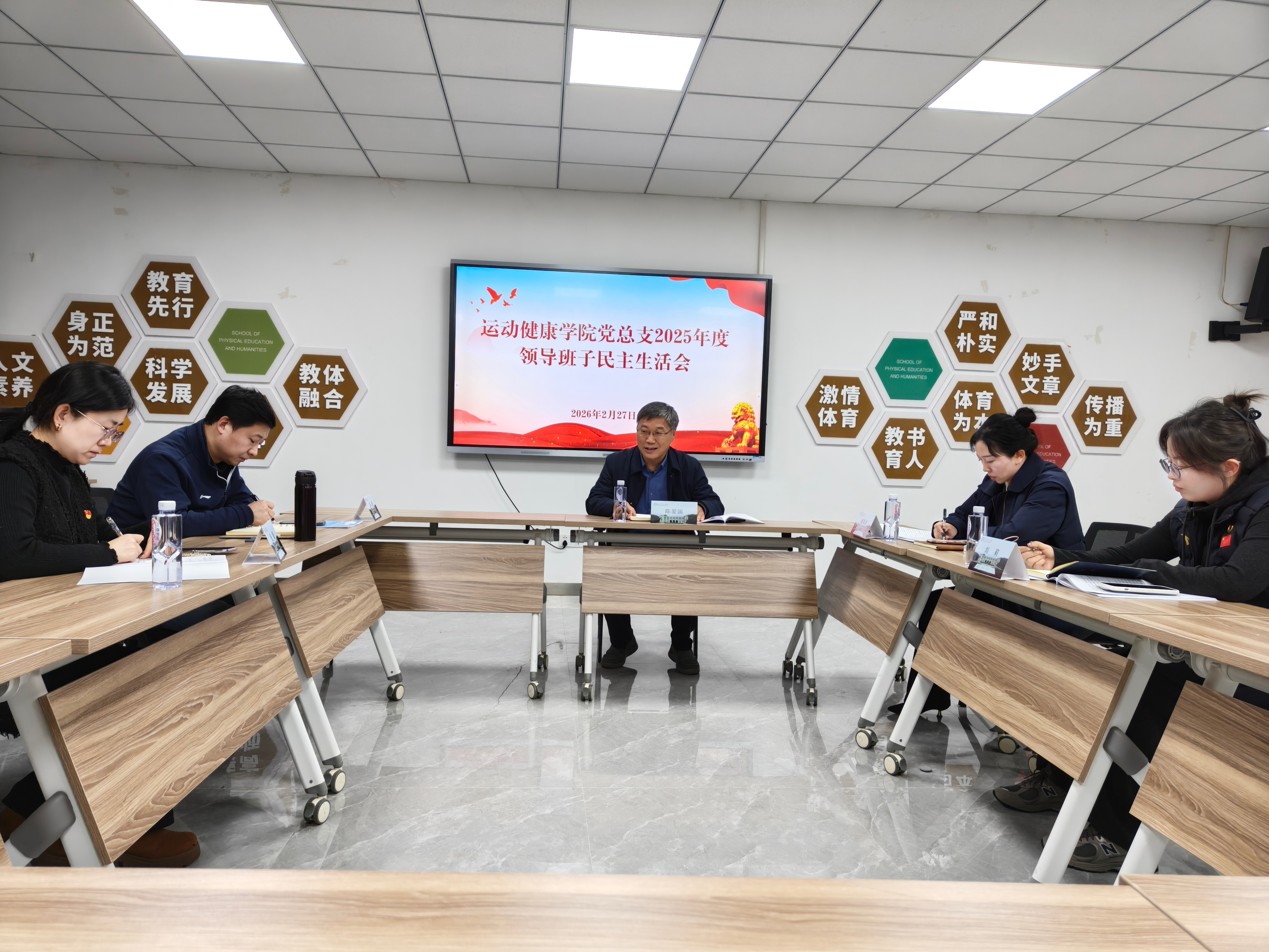 2月27日下午,运动健康学院党总支在教学办公楼220会议室召开2025年度领导班子民主生活会。校党委常委、副校长陈爱国到会指导,会议由学院党总支书记阚妮妮主持,学院领导班子成员参加会议。