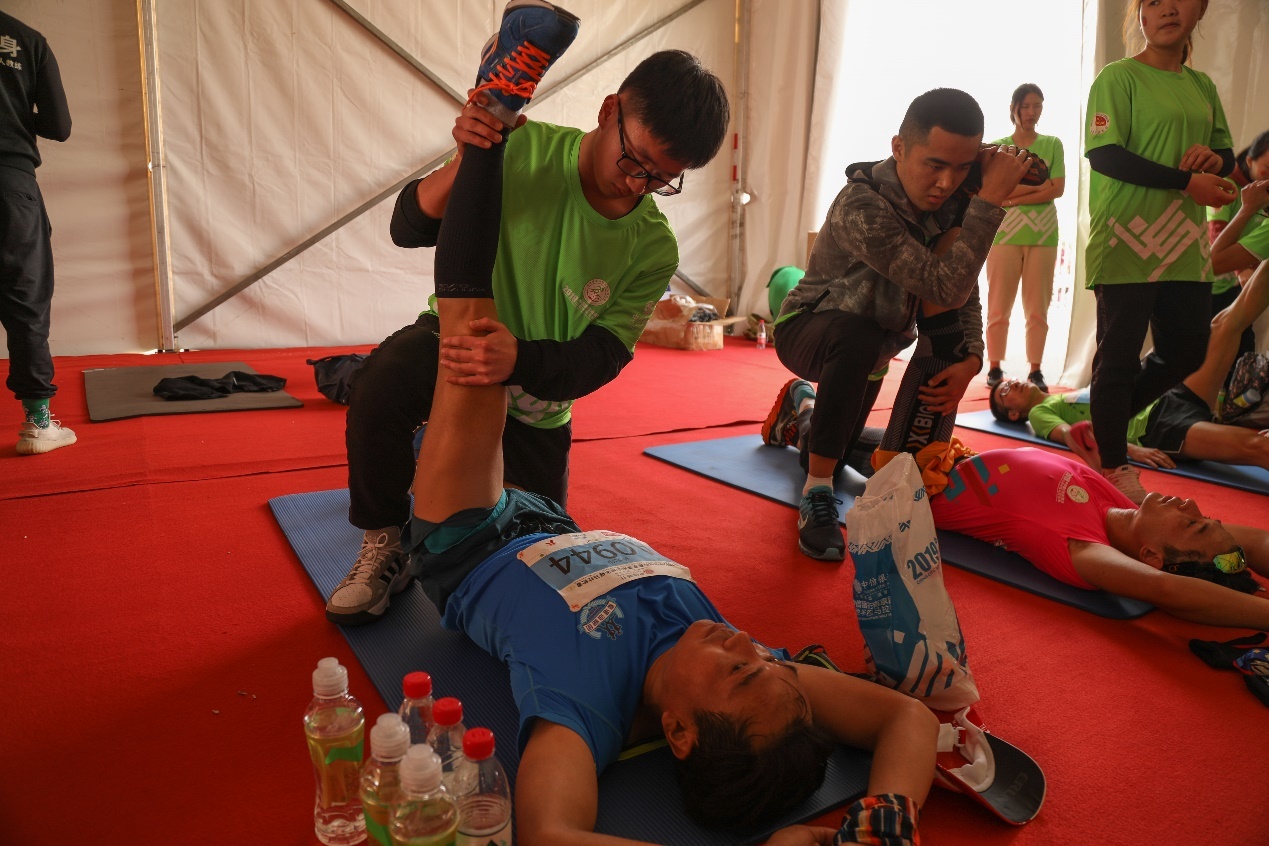 比赛当天,我系志愿者们六点整全部抵达赛场,大家分工明确、井然有序,做好各项准备工作。参赛选手陆续抵达终点,志愿者们迅速投入紧张忙碌工作之中。志愿者们运用静态牵伸、按摩等放松手段为参赛选手们缓解运动后的疲劳,专业的操作和饱满的热情获得了参赛者及在场专业人士的一致好评。