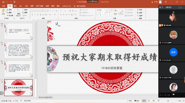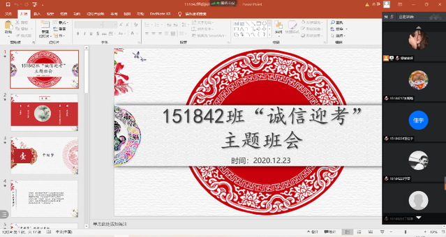 12月23日晚20:00,班主任张俊芬老师通过线上为本班举行了“诚信迎考”为题的主题班会。本次班会分为四个板块:1、中国梦。2、社会主义核心价值观。3、学习十九届五中全会精神。4、诚信考试。