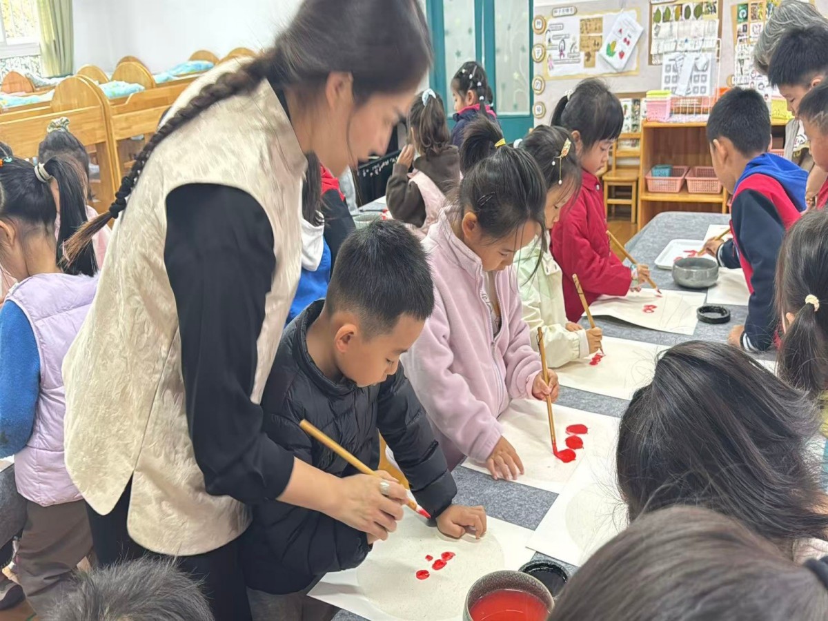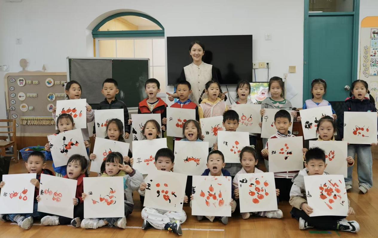到了小朋友们动手创作时,他们纷纷拿起画笔,有模有样地蘸墨、调色。尽管小手还有些稚嫩,线条也不够流畅,但他们积极发挥想象力,大胆创作。有的小朋友给樱桃添上了杆,有的则画了盘子盛放樱桃。杨老师穿梭在孩子们中间,给予一对一的指导,及时肯定他们的创意,并帮助解决遇到的问题。