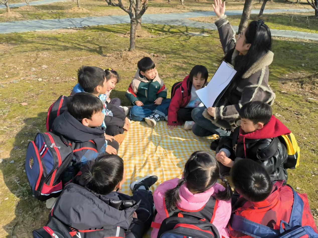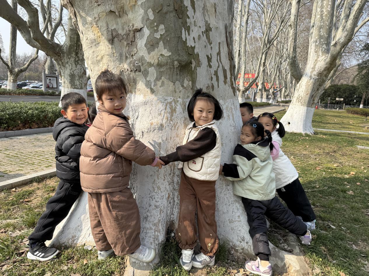 中班的幼儿在老师的带领下,来到了南京体育学院,认真地挑选着自己心仪的大树,仿佛在寻找一位即将陪伴自己成长的特殊伙伴。