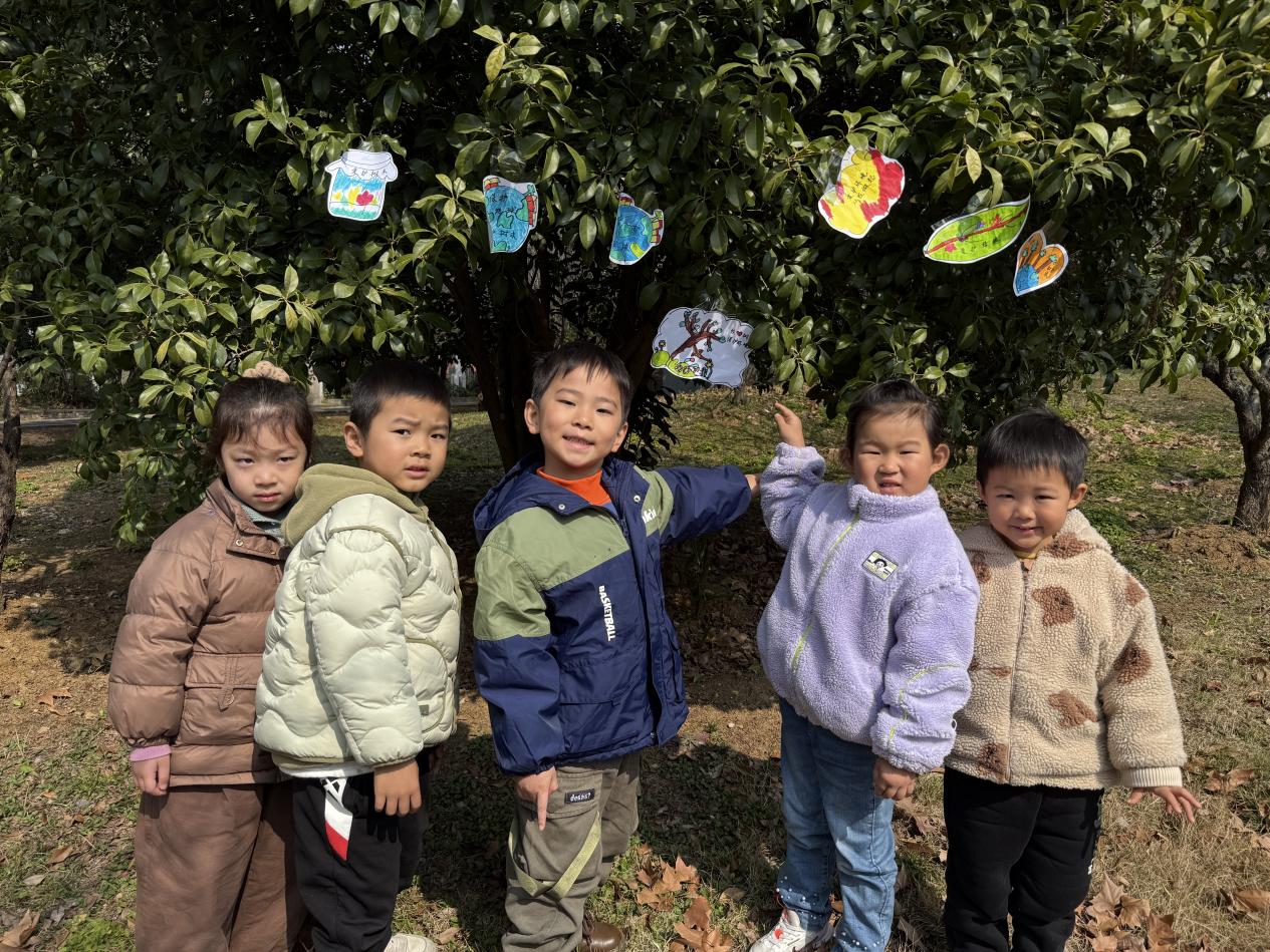 认养活动时,幼儿兴奋地和大树合影留念,并亲手将认养牌为大树挂上。大班幼儿在活动中主动承担照顾任务,增强责任意识与任务意识。