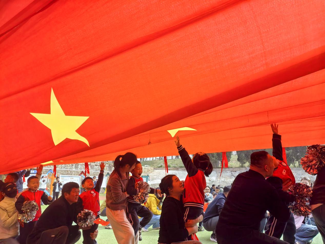 看!五星红旗迎风飘扬,象征着我们的祖国繁荣富强,寓意着我们的小小运动员会在祖国的关爱下茁壮成长。