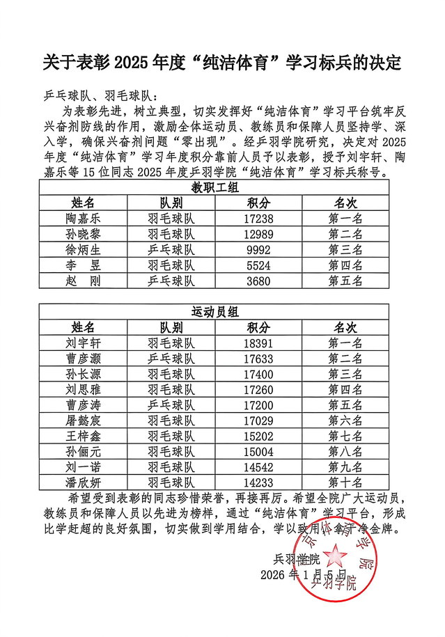 关于表彰 2025 年度“纯洁体育”学习标兵的决定