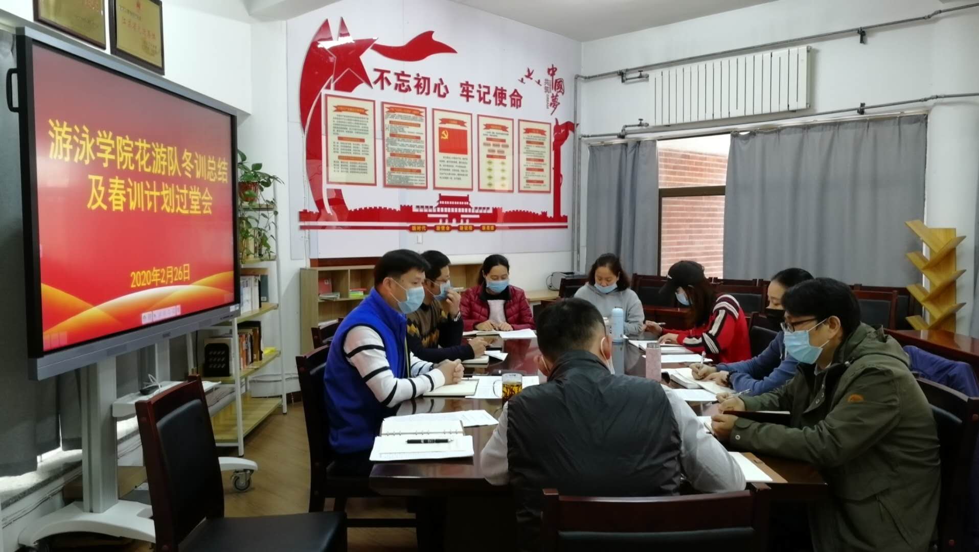2月26日上午,游泳学院花样游泳队在跳水花游馆二楼会议室召开2020年冬训总结、春训计划过堂会。游泳学院全体党总支委员、花游队管理干部和教练员参加了会议。